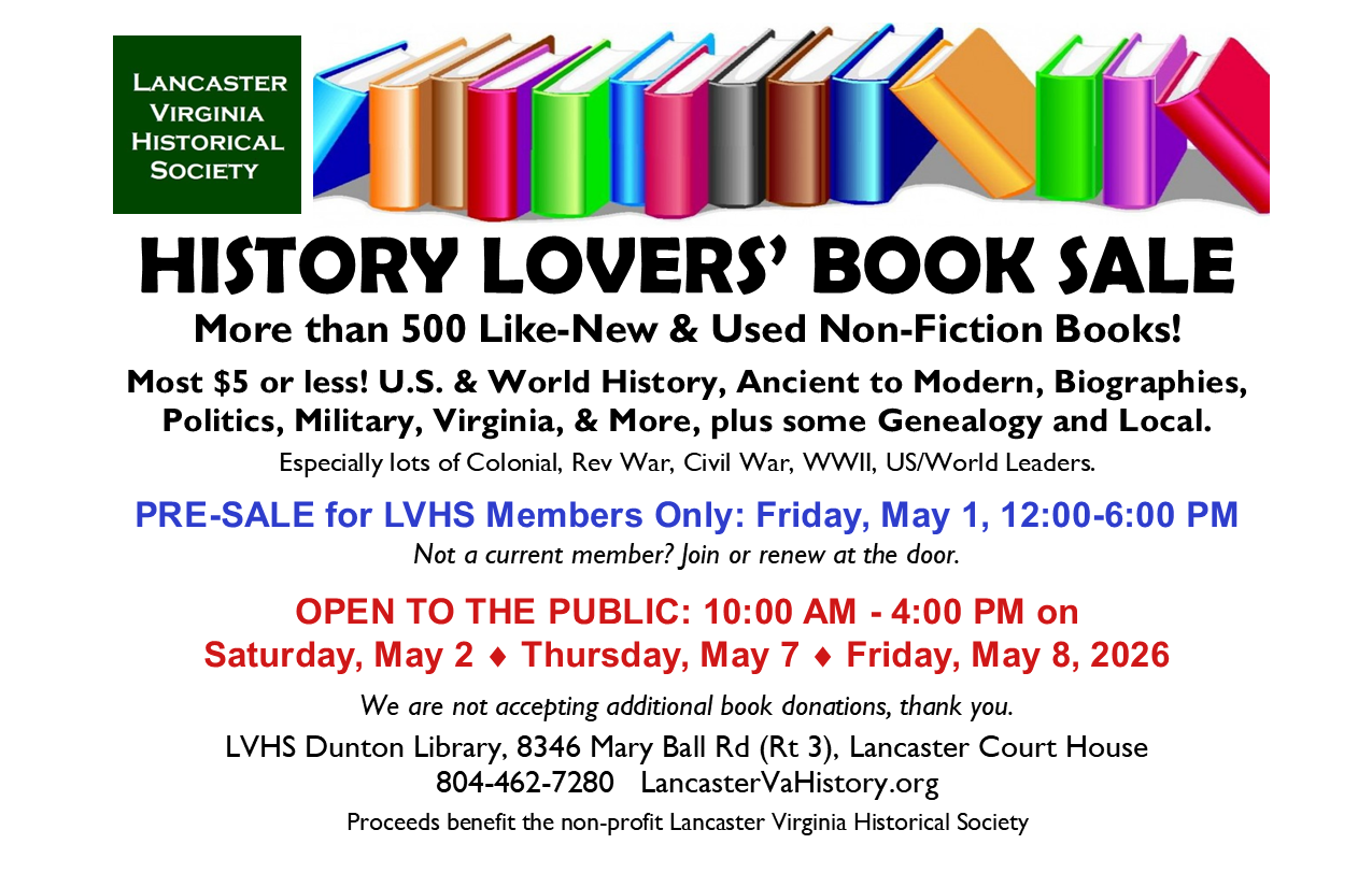 Five FREE monthly talks in different locations throughout the Northern Neck. All programs are on Sundays at 2:00 PM. Recordings are made in most cases and posted at https://www.youtube.com/@NorthernNeckTourism/videos